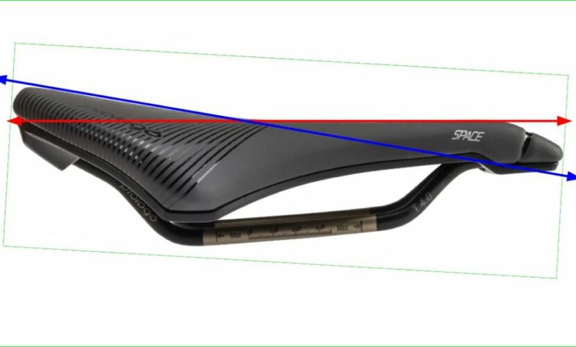 - La selle doit avoir une inclinaison à 0° ou légèrement négative (maxi -5°) … jamais positive sinon douleurs au périnée → l’utilisation d’une application « Niveau à bulle » sur votre smartphone peut-être très utile pour ce réglage (voir dessin ci-dessous, réglage entre trait rouge et bleu).